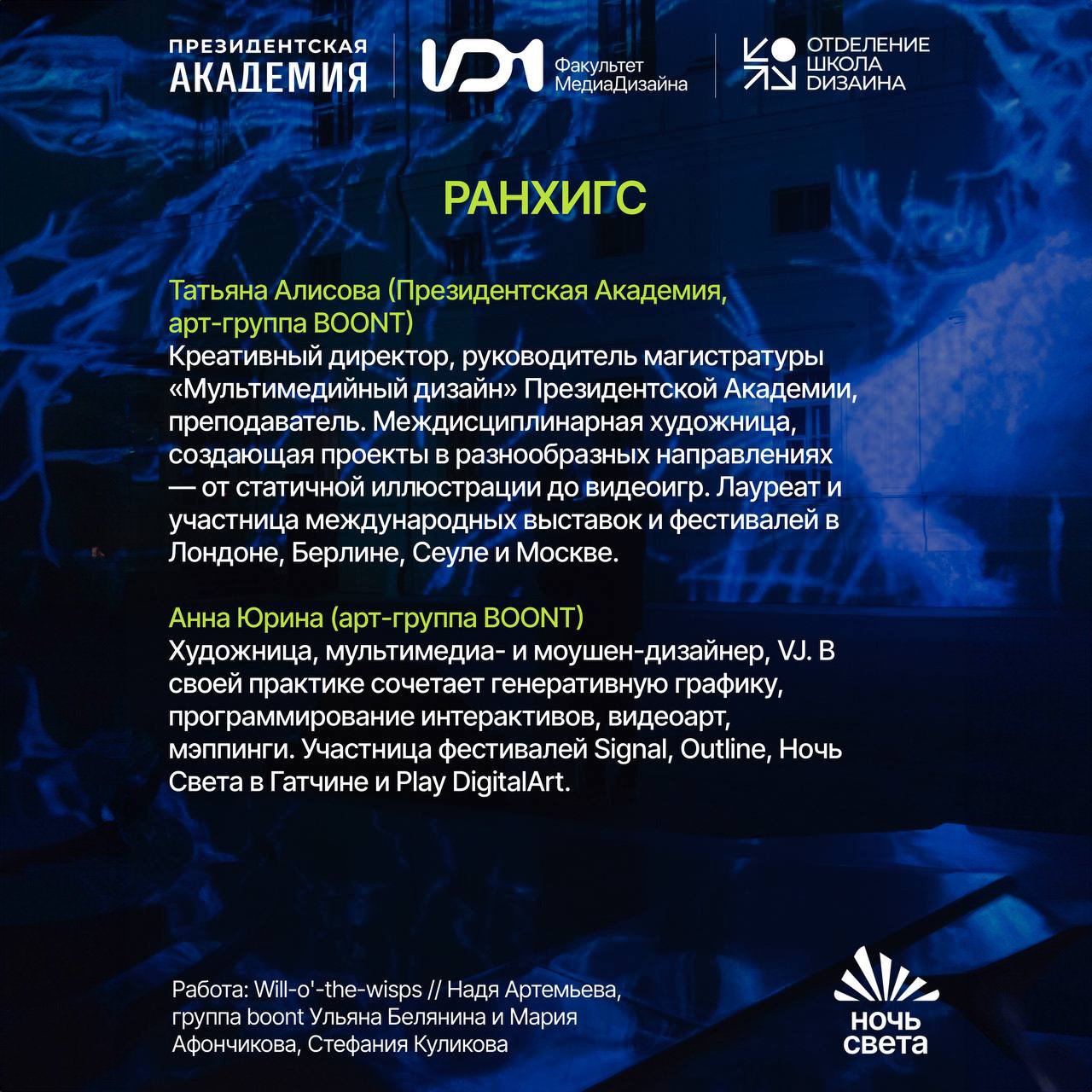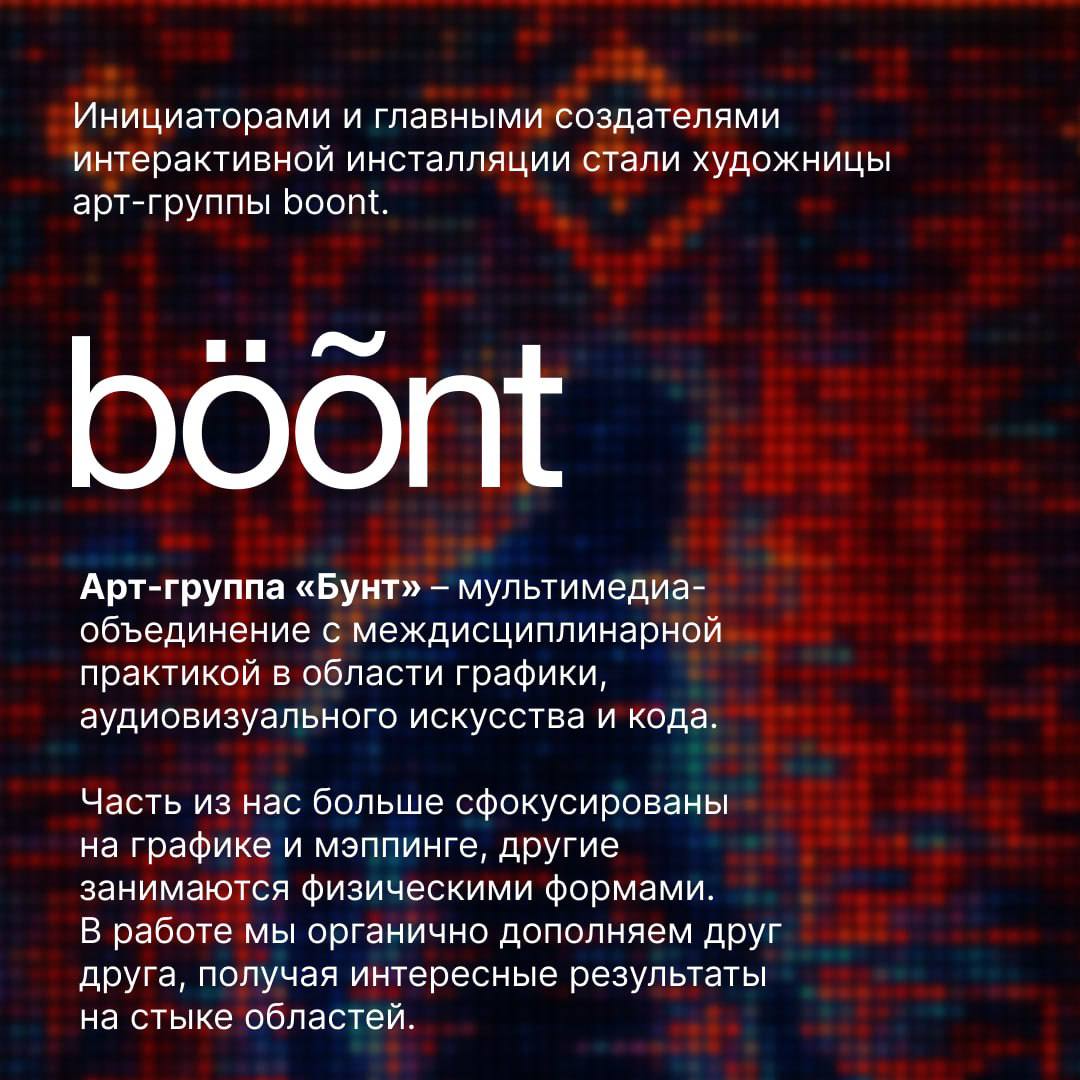 В программу фестиваля вошел проект Dust.exe, созданный инициативной творческой группой Boont («Бунт»), с практикой в области графики, аудиовизуального искусства и кодинга, с участием преподавателей факультета дизайна и медиакоммуникаций ИОН Президентской академии.
