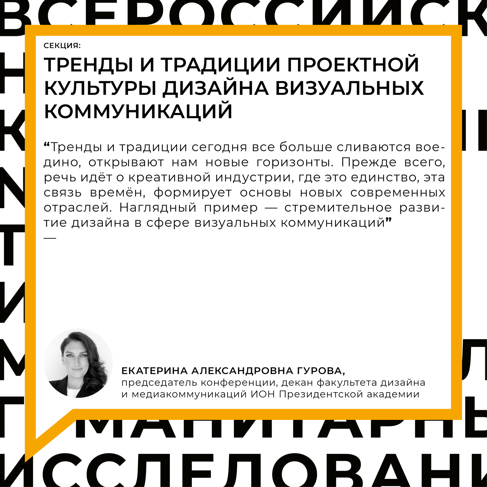 “Тренды и традиции сегодня все больше сливаются воедино, открывают нам новые горизонты. Прежде всего, речь идёт о креативной индустрии, где это единство, эта связь времён, формирует основы новых современных отраслей. Наглядный пример — стремительное развитие дизайна в сфере визуальных коммуникаций” — рассказала Екатерина Александровна Гурова, председатель конференции, декан факультета дизайна и медиакоммуникаций ИОН Президентской академии.