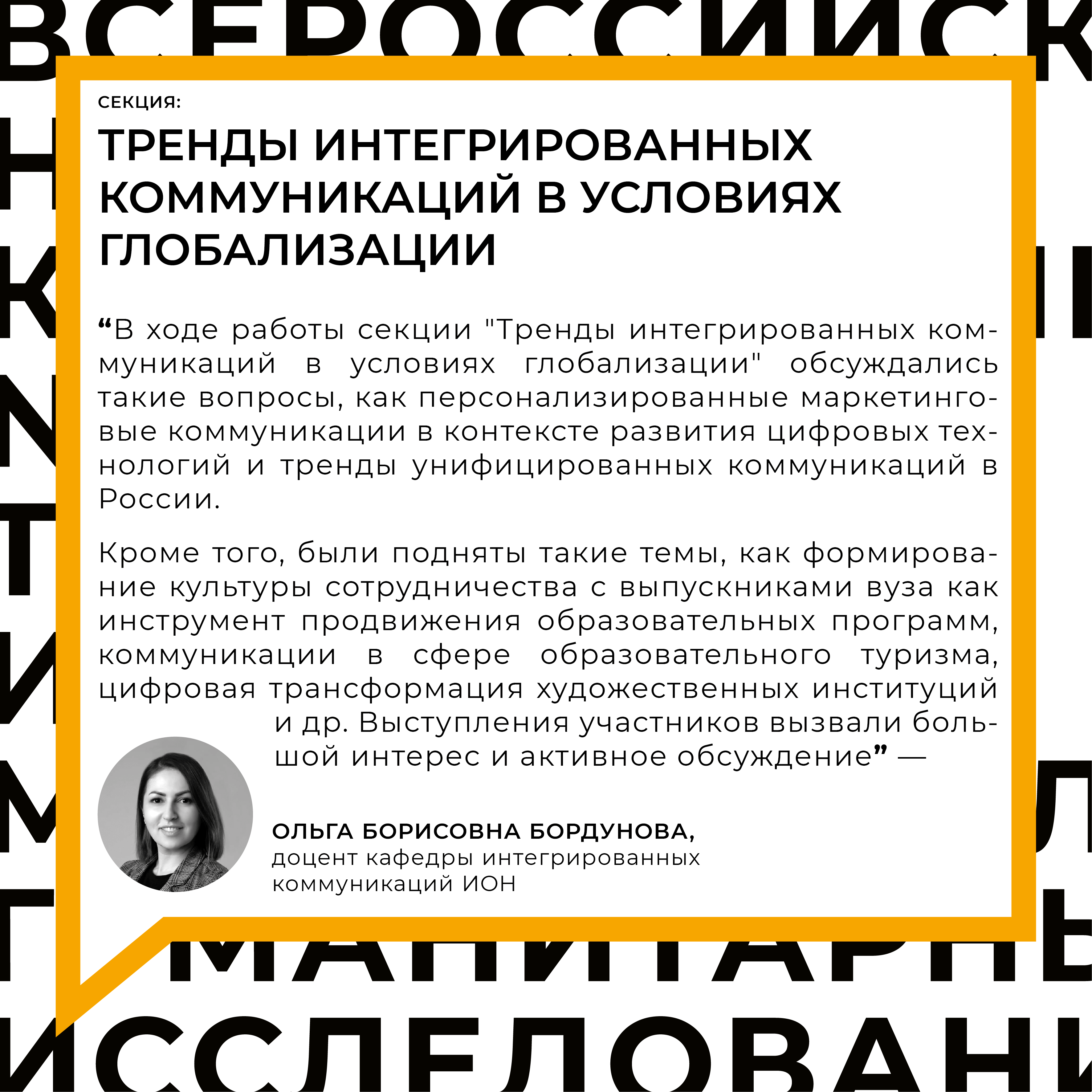 Кроме того, были подняты такие темы, как формирование культуры сотрудничества с выпускниками вуза как инструмент продвижения образовательных программ, коммуникации в сфере образовательного туризма, цифровая трансформация художественных институций и др. Выступления участников вызвали большой интерес и активное обсуждение" — подытожила Ольга Борисовна Бордунова, доцент кафедры интегрированных коммуникаций ИОН.