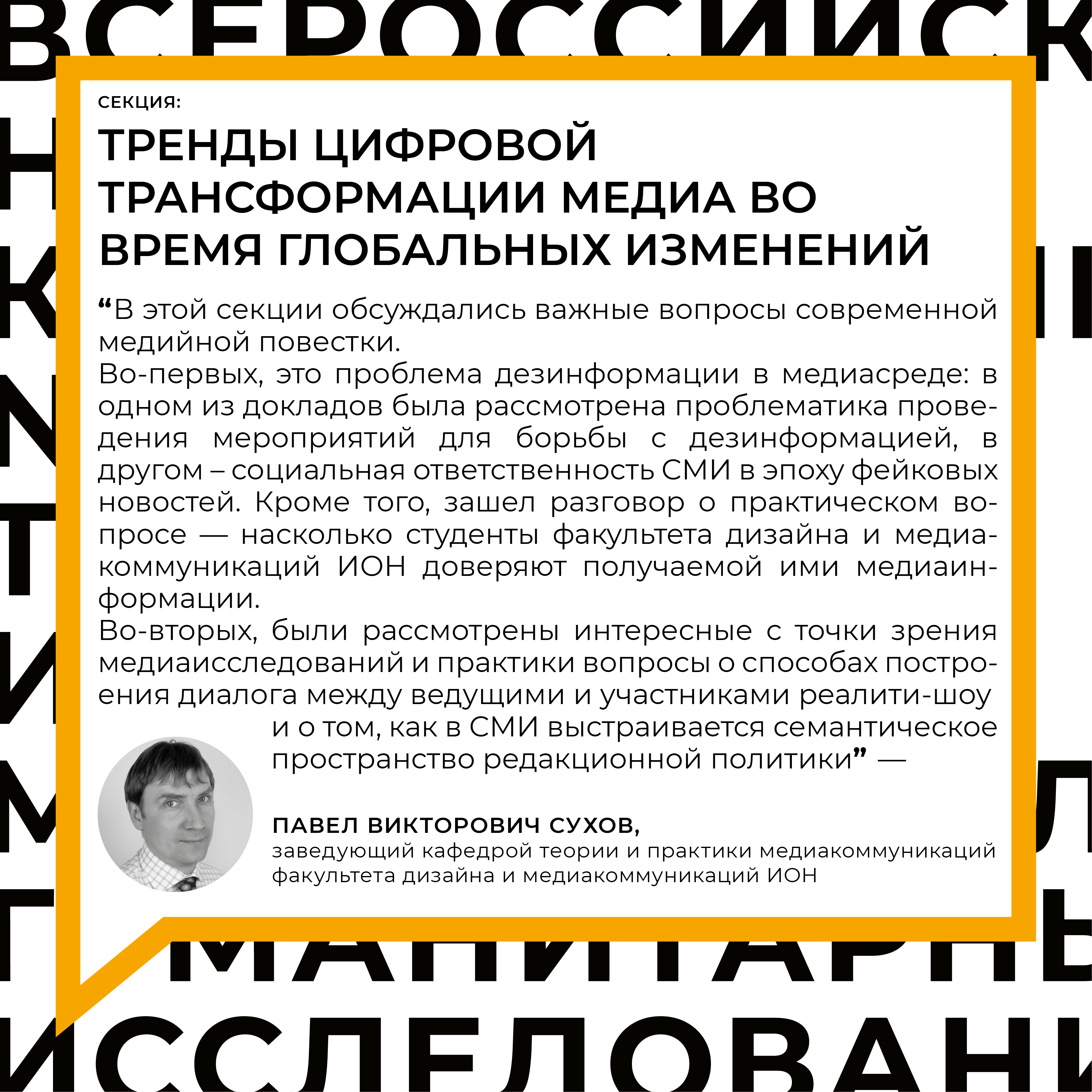 Во-вторых, были рассмотрены интересные с точки зрения медиаисследований и практики вопросы о способах построения диалога между ведущими и участниками реалити-шоу и о том, как в СМИ выстраивается семантическое пространство редакционной политики” — дополнил Павел Викторович Сухов, заведующий кафедрой теории и практики медиакоммуникаций факультета дизайна и медиакоммуникаций ИОН.